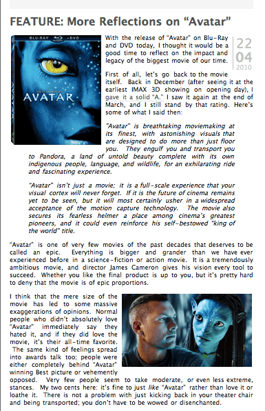 The piece I chose to submit was my feature from a few weeks ago “More Reflections on Avatar.”  I spent a lot of time writing it, and I do think it has a lot of good analysis and some of my deepest thinking yet.  I’d love for you to give it a second glance.  It may not be the best thing I’ve ever written, but I’m sure it’s one of my most underrated.